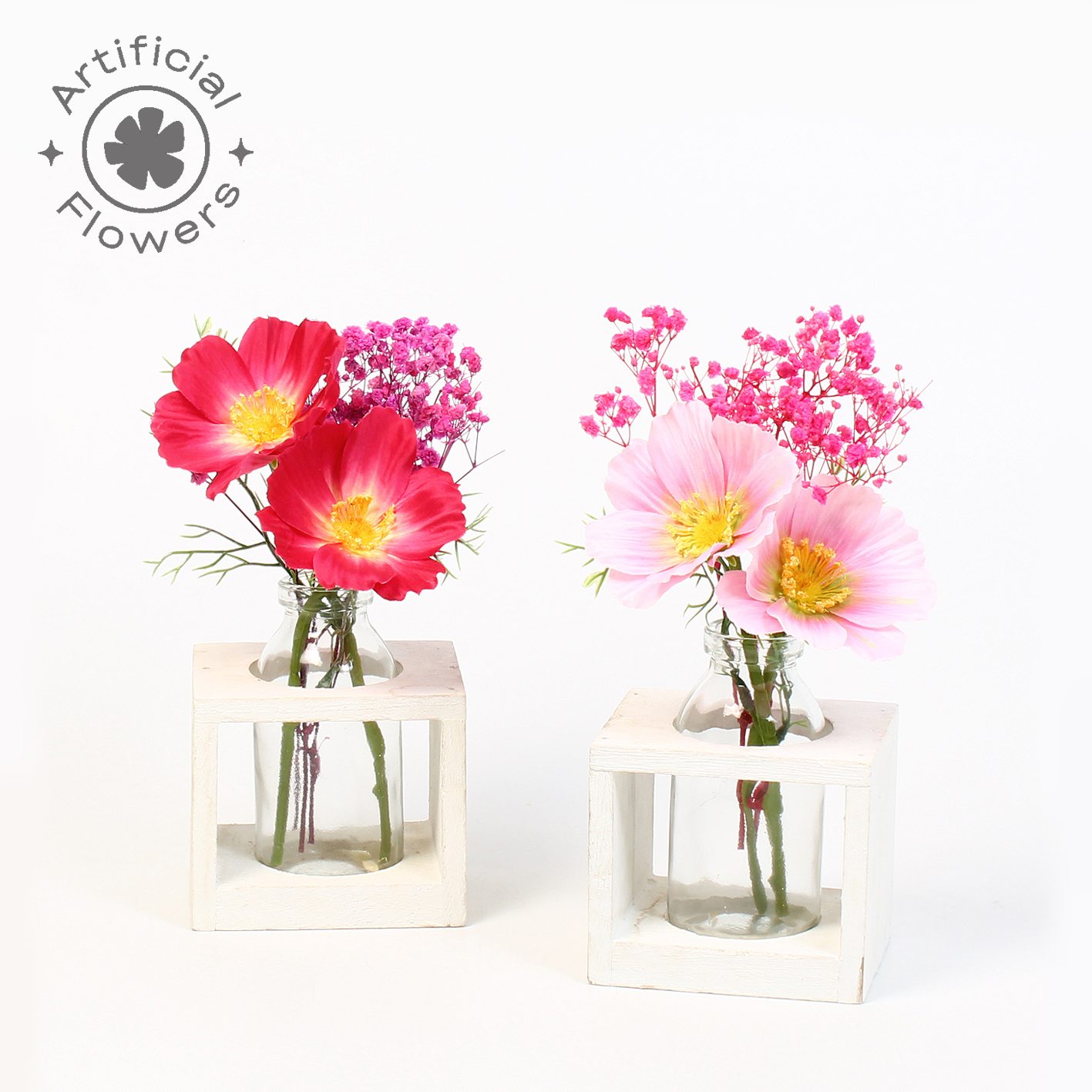 Artificial arr Cosmos in glazen vaasje met houten rek