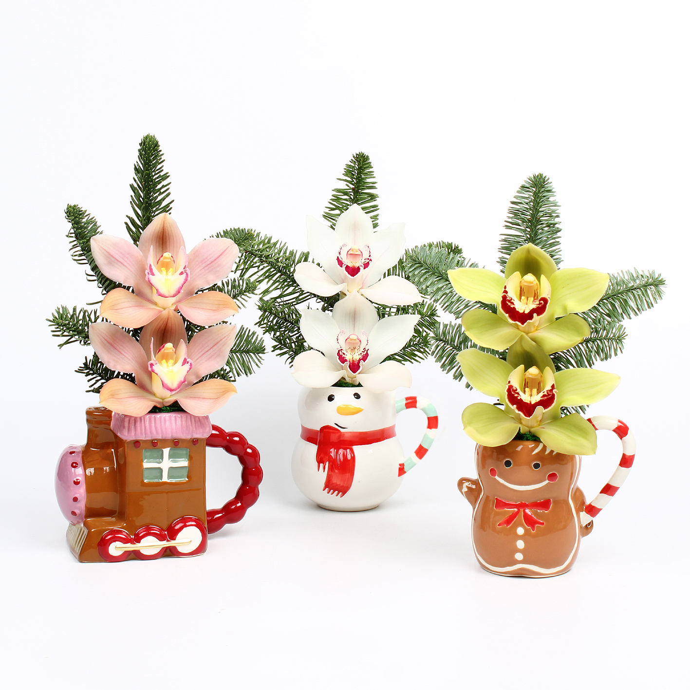 Cymbidium arr Kerst 2 bl in kerstmokkenmix van gingerbreadtrein, gingerbread en snowman