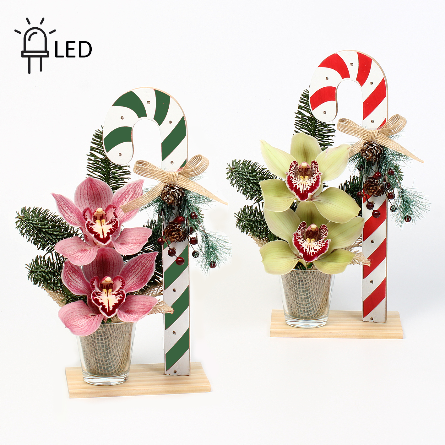 Cymbidium arr Kerst LED 2 bl op houten plankje met candycane