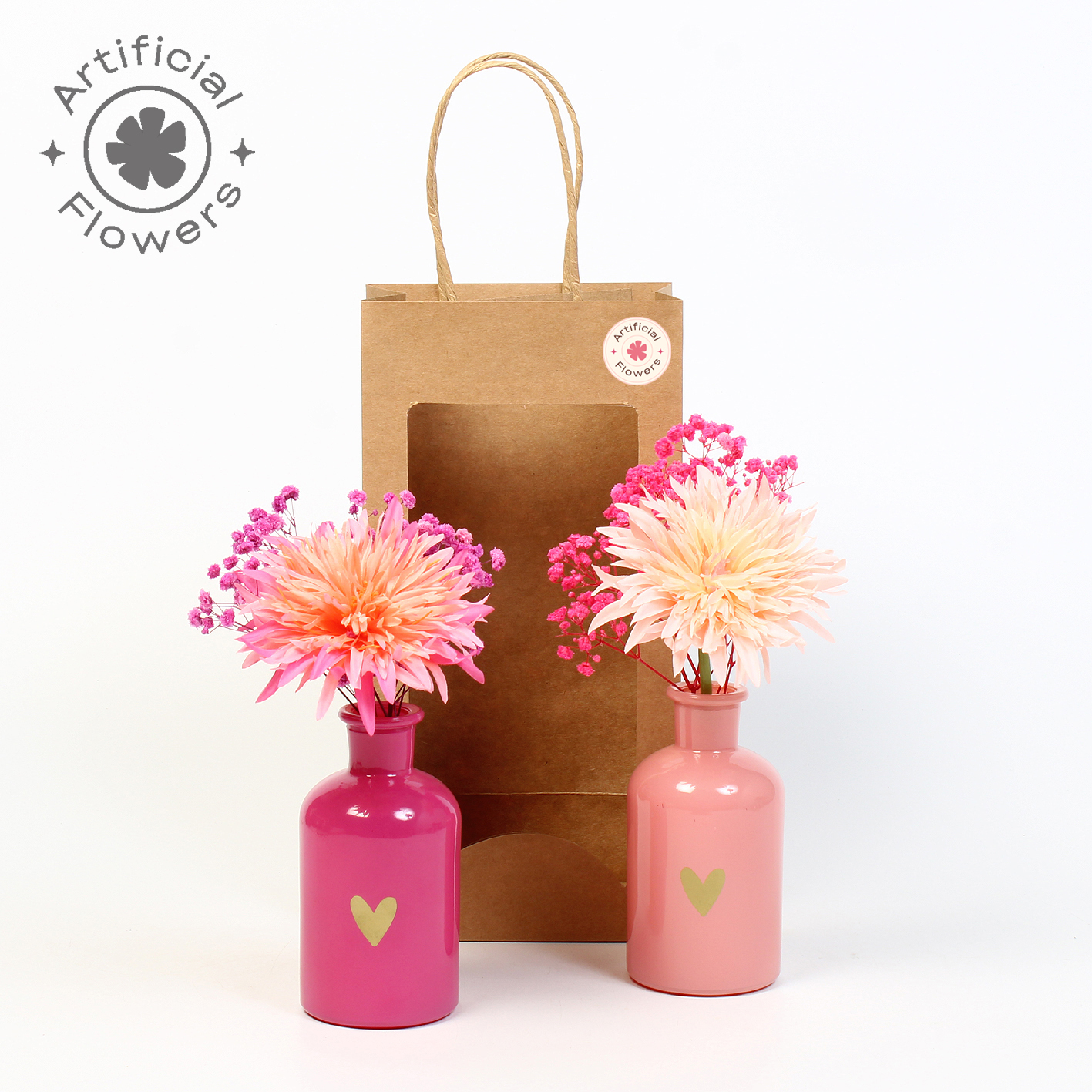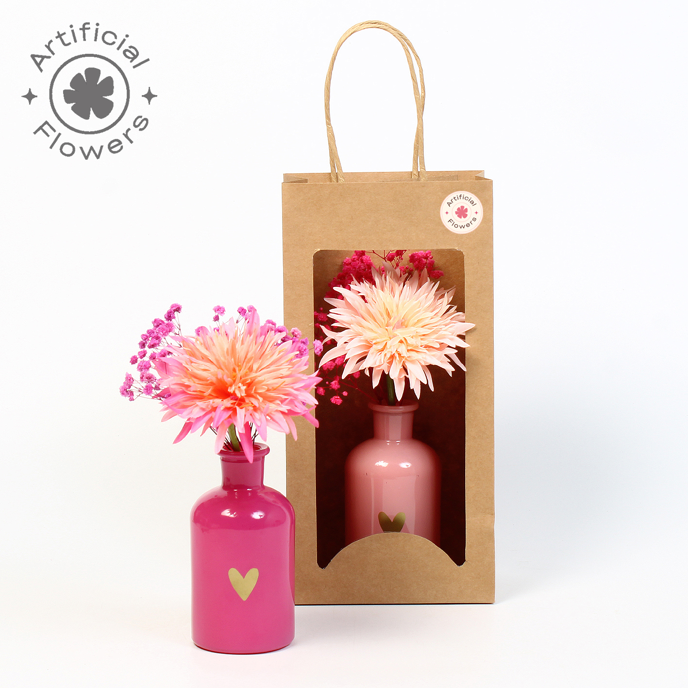 Artificial arr Gerbera wild in glazen decovaasje in kraft tas