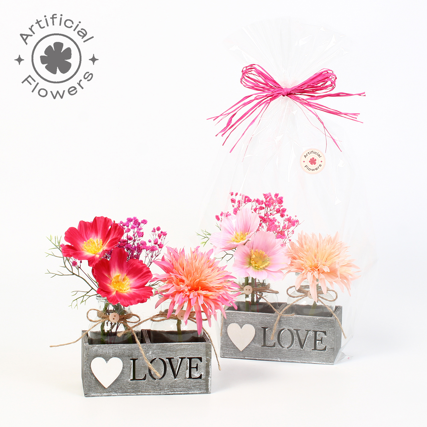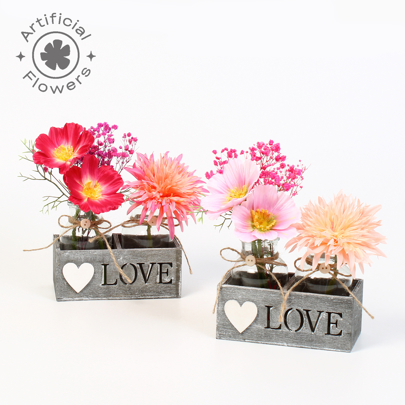 Artificial arr Mix in houten 'love'-bakje met 2 glasvaasjes