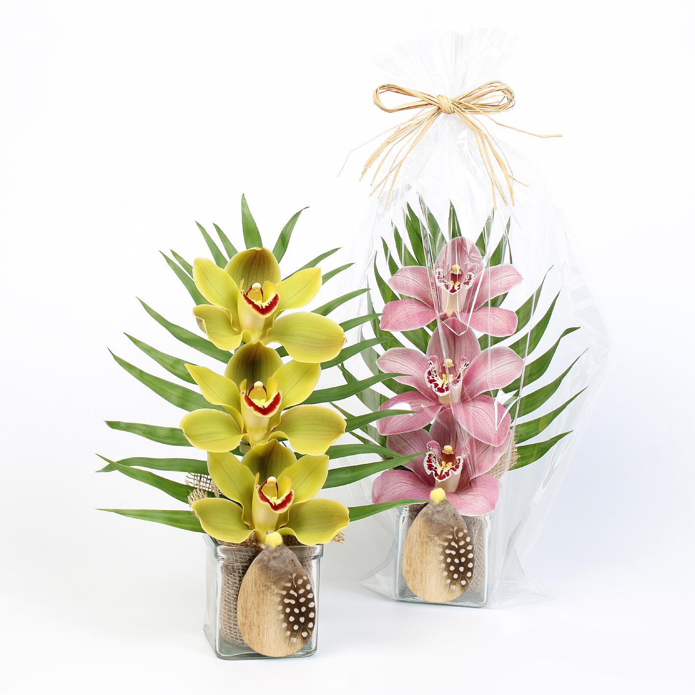 Cymbidium arr Pasen 3 bl in glazen accubakje