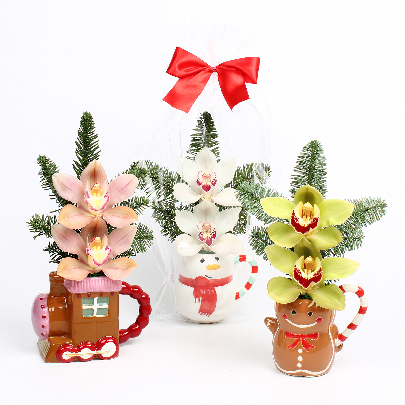 Cymbidium arr Kerst 2 bl in kerstmokkenmix van gingerbreadtrein, gingerbread en snowman