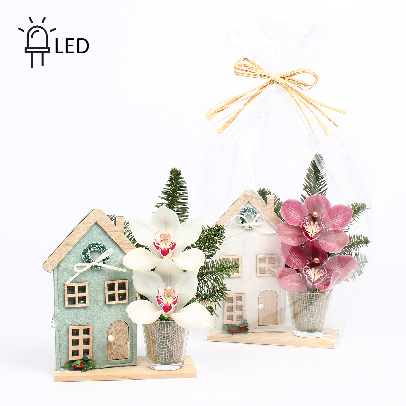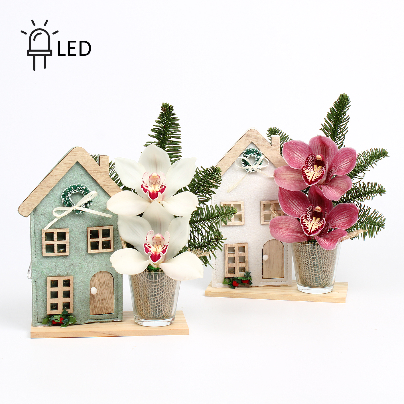 Cymbidium arr Kerst 2 bl op plateau met vilten kersthuis met LED