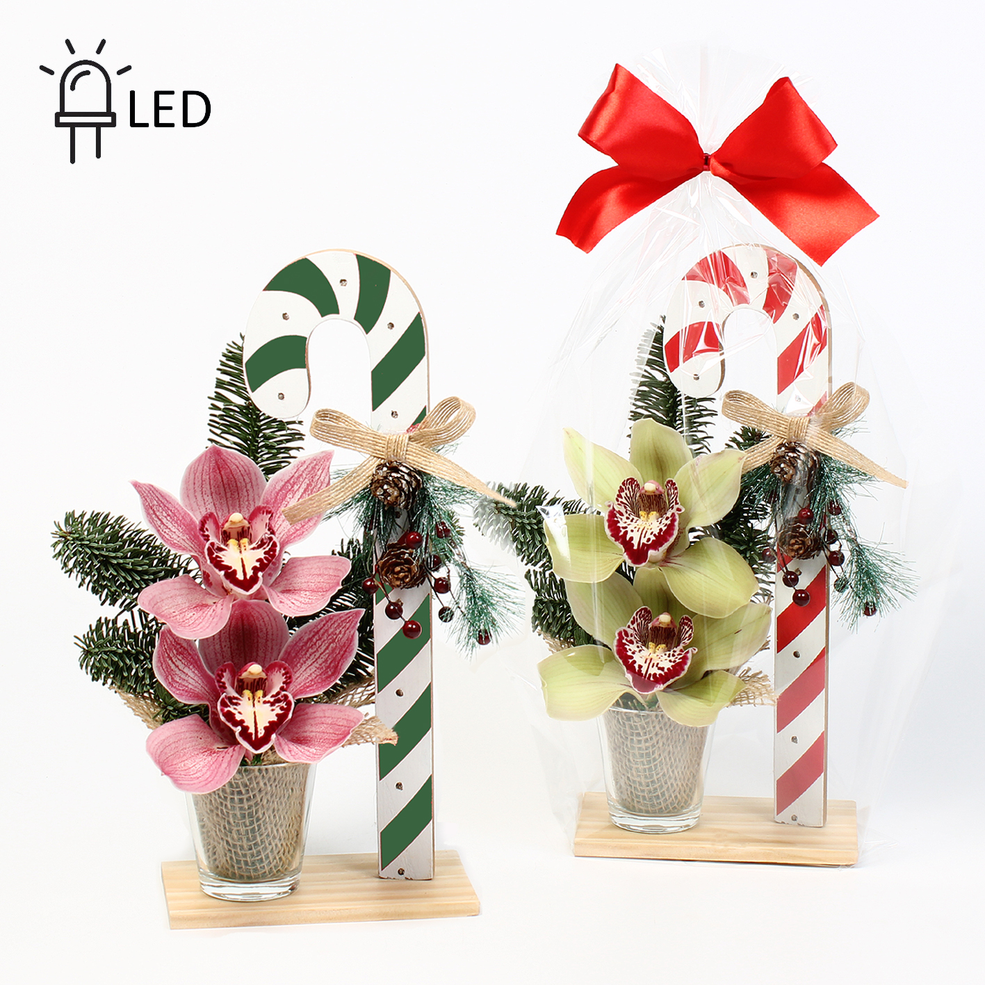 Cymbidium arr Kerst LED 2 bl op houten plankje met candycane