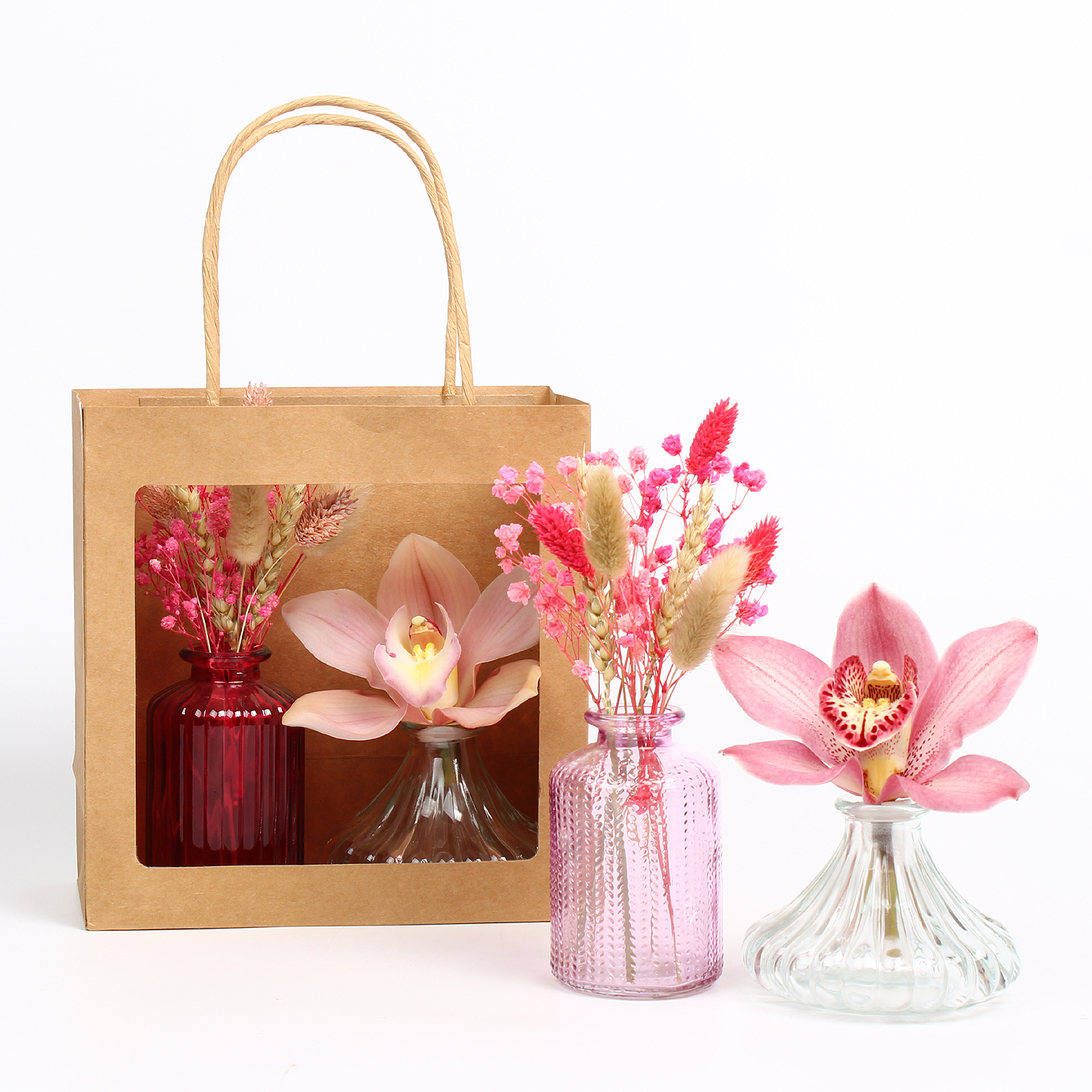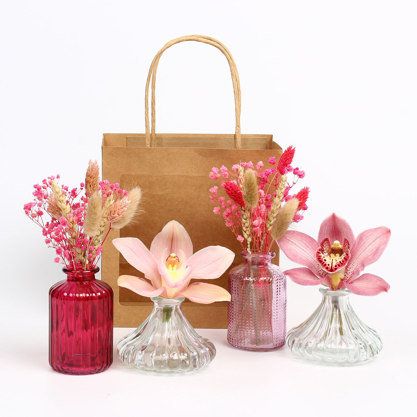 Cymbidium arr Pink October 1 bl in glazen vaasjesset in tas