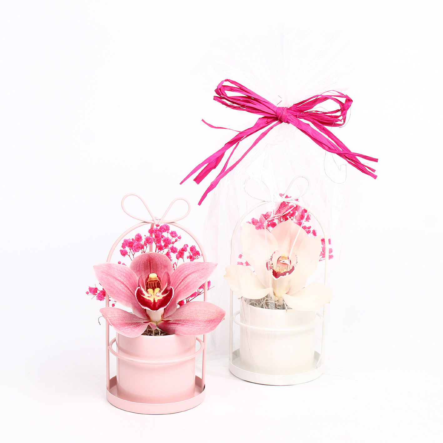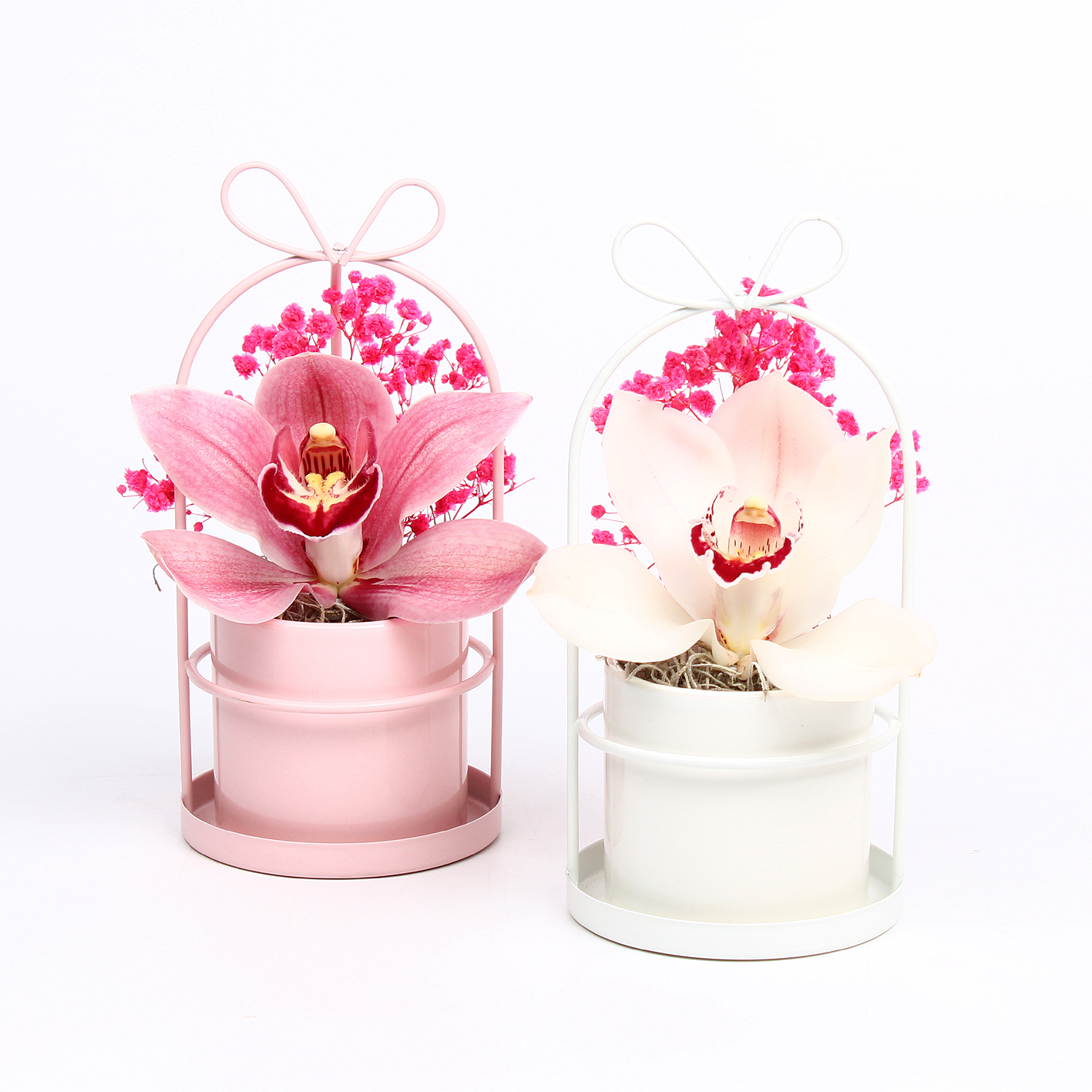 Cymbidium arr Pink October 1 bl in keramieken potje met metalen frame