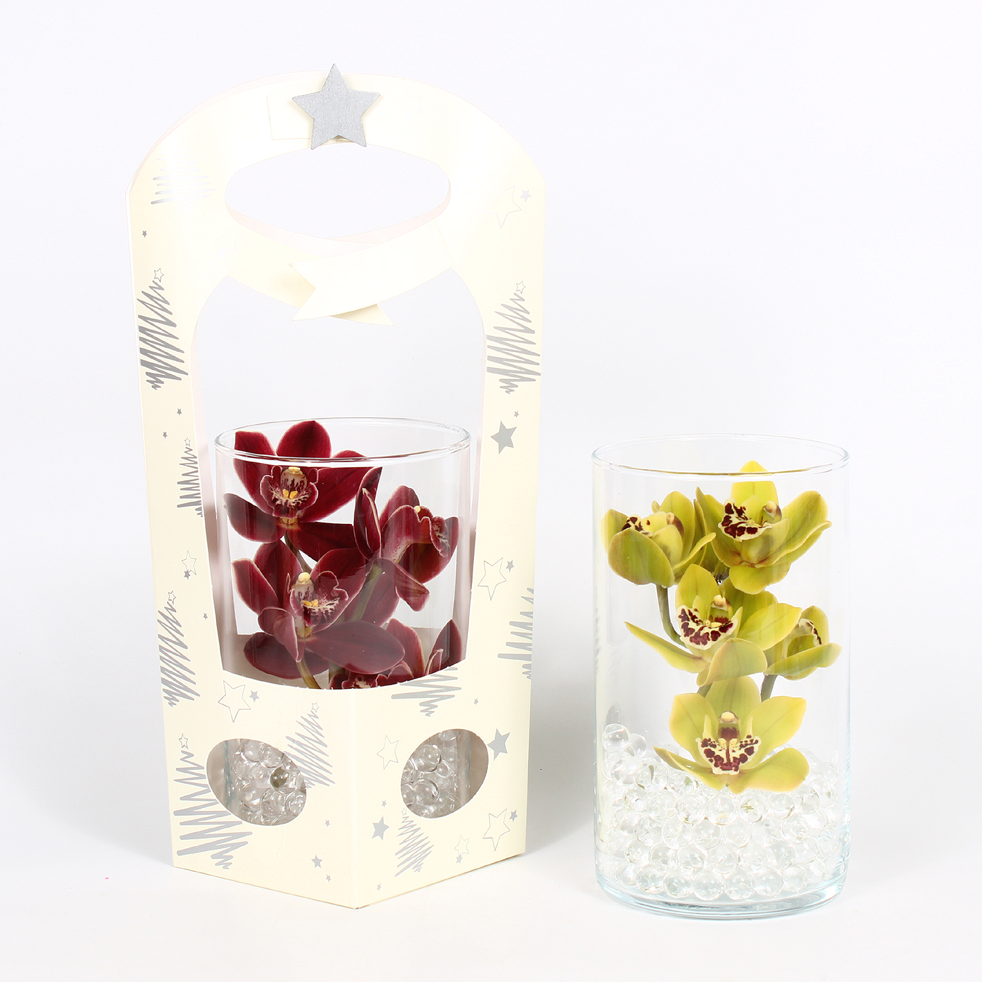 Mini Cymbidium arr in Cilindervaas Ø12xH20cm in eco bag