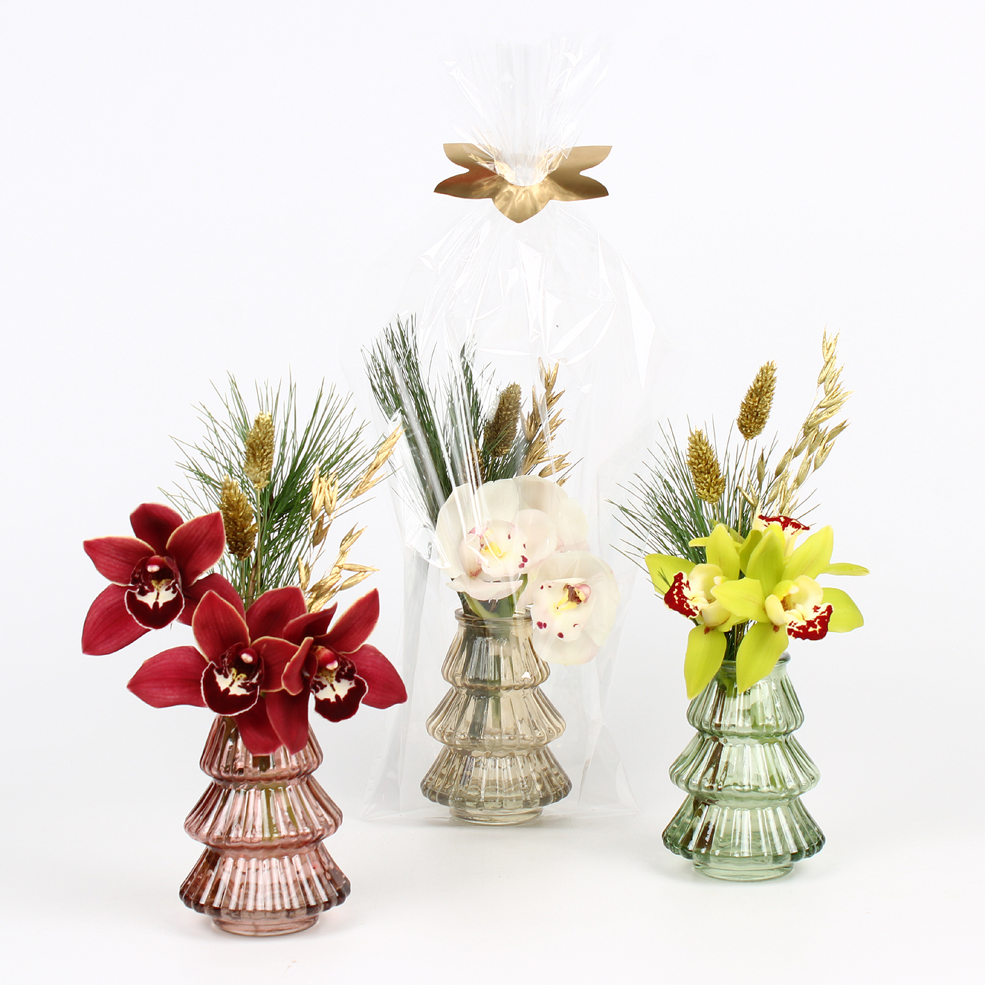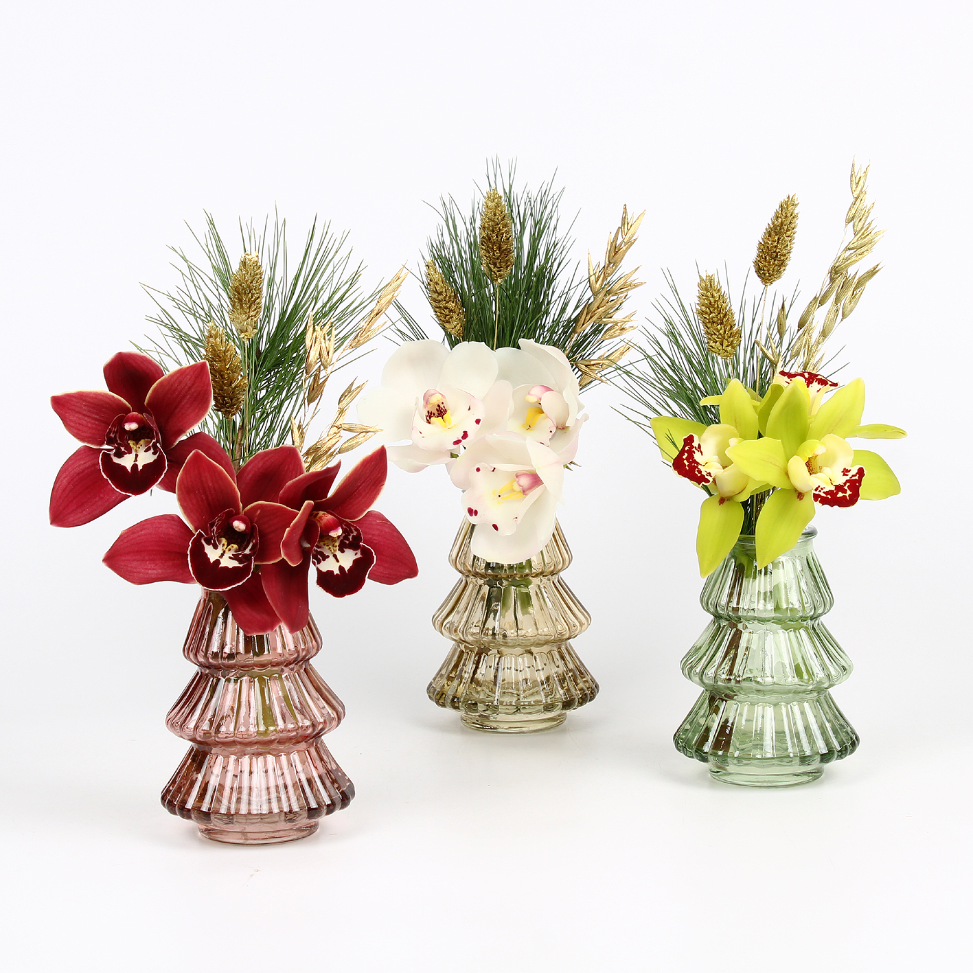 Mini Cymbidium arr Kerst 3 bl-takje in glazen deco kerstboomvaas